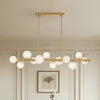 A nod to chic mid-century style. our kitchen island pendant features 12 frosted glass spheres strewn on a horizontal linear bar. The result is an enchantingly ethereal look. reminiscent of bubbles gathering around a straw. Designed for use with G9 bulbs (not included). this bubble island chandelier offers a delightful romantic ambient lighting. enveloping the brushed brass frame and milky white globes. Perfect for open spaces. this 12-light brass frosted glass globe linear chandelier adds a stunning level of sophistication. especially when suspended above key areas such as dining rooms. kitchen islands. home bars. counters. and more.Details