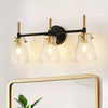 Three Lights • Bell Shade • Clear/Textured Glass • Black + Brass Finish • Bathroom Light • E12 Candelabra Bulbs (Not Included) • Hardwired • ETL