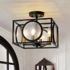 Finished in matte black. this semi-flush mount ceiling light showcases an open square cage with circular accents on each of its four sides. highlighted by matching glass rounds. Inside the airy lantern. four candle-style light holders finished in antique gold add a pop of brilliance to this industrial ceiling light. while complementing a traditional farmhouse look with four E12 candelabra bulbs (not included). The clear. textured glass rounds gently diffuse the light. creating a warm. inviting glow without glare. Ideal for brightening entryways. kitchens. dining rooms. bathrooms. stairwells. bedrooms. or laundry rooms. this 4-light cage semi-flush mount is a practical and versatile fixture that easily pairs with any decor style.