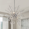 Our 6-light chandelier skillfully blends the sputnik style with bubble elegance. capturing the essence of modern romance and subtle luxury. Finished in polished chrome. this sputnik light fixture showcases a timeless sunburst design adorned with transparent glass balls of varying sizes. reminiscent of delicate strings of crystal-like candied haws. Six G9 bulbs (not included) are evenly positioned on the central sphere. casting a warm and inviting glow. Perfect for dining rooms. living rooms. entryways. kitchen islands. bedrooms. or bathrooms. this glass globe bubble chandelier brings eclectic charm and a serene ambiance to rejuvenate your space.
