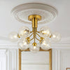 This Mid-Century modern Sputnik semi flush mount light features a creative design with curved arms arranged in tiers. resembling a cascading bouquet blooming from the ceiling. Nine clear water glass globes are attached to each arm. adding an adorable bubble-like charm to the sputnik light fixture. When illuminated. the hammered texture of the glass gently diffuses the glow from G9 LED bulbs (not included). creating a soft. ripple-like effect that fills the space with subtle. atmospheric lighting. The brushed brass finish brings an elegant touch of luxury. while the matte black option adds a sleek. contemporary vibe. Perfect for elevating the ambiance in a kitchen island. dining room. living room. bathroom. bedroom. entryway. or foyer. this 9-light glass globe bubble Sputnik chandelier seamlessly blends both function and style.