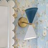 Inspired by the timeless hourglass silhouette. this modern 2-light wall sconce features dual metal cone shades with clean. sculptural lines and color-block design. Brushed brass accents lend a touch of mid-century warmth. while two carefully curated color pairings let you express either bold personality or soft serenity.