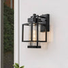 Bring a touch of modern farmhouse luxury to the outdoors with this 1-light outdoor wall lantern. Crafted with a matte black finish. this 1-light wall lamp features an open square metal frame protecting a long rectangle hammered glass shade ensconced one E26-base bulb (excluded). which creates cozy and inviting ambient lighting. Water-proof and equipped with a dusk to dawn sensor. this square cage wall sconce is the ideal outdoor lighting choice perfect for illuminating any porch. patio. garage. balcony. or damp location.Details