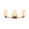 Chic and elegant. this bathroom wall light captures the essence of modern mid-century style with a warm. inviting glow. Crafted of milky white glass. three cylindrical shades evenly perch on a horizontal frame. creating a refined visual balance. Ideal for illuminating mirrors. vanities. bathrooms. bedrooms. or dressing areas. this sophisticated 3-light vanity sconce is designed to make a statement. The rich brushed brass finish lends a timeless touch of mid-century luxury. while the frosted glass add an upscale appeal and soften lighting for cozy ambiance when lit.