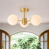 Mid-Century modern and minimalist styles are blended perfectly with this illustrious sputnik ceiling light. This semi flush mount light features three short arms bursting out from a central cylinder housing to support three glass globe shades. displaying an alluring bubble design that will elevate your entry. kitchen. dining room. living room. bedroom. or bathroom. Crafted with a warm brass. this 3-light opal glass globe semi flush ceiling light offers an elegant and sophisticated touch to your space.