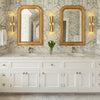 Elevate your space with a dash of Mid-Century Modern luxury through this sleek 2-light up and down wall sconce. Embodying the timeless hourglass shape. its dual-cone metal shades feature a sumptuous brushed brass coating. exuding refined glamour. Emitting an inviting. harmonious radiance upwards and downwards. this adaptable wall light can be installed horizontally or vertically to complement your layout. An ideal choice for hallways. bedrooms. living rooms. or vanity areas. this dual cone wall lamp commands attention. whether solo or in a set.