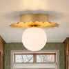 Simple yet striking. this 1-light globe semi-flush mount seamlessly blends mid-century modern charm with contemporary elegance. Featuring a warm gold finish. the ceiling light showcases a sunburst-inspired metal base with zigzag radiant ray design. evoking the glamour of Hollywood Regency and Art Deco styles. Suspended beneath the center. a glossy opal glass globe softly diffuses the light. casting a warm and welcoming glow throughout the space. Ideal for closets. entries. bedrooms. stairwells. kitchens. or hallways. this radiant ceiling light adds a touch of sophistication and artistic flair to any interior.