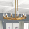 Elevate your space with our captivating yet understated 12-light wagon wheel chandelier. blending modern glam-luxe inspiration with farmhouse charm. Ideal for your dining room. kitchen island. living room. entryway. or hallway. this round chandelier boasts a sizable ring profile and an open. airy appearance. Enhanced with long cylindrical shades crafted from clear glass. each delicately balanced around the circular frame. this circular pendant light exudes contemporary elegance. Inside each shade lies a candelabra-style socket compatible with E12 candelabra bulbs (bulbs not included). adding a touch of tradition to its modern design.